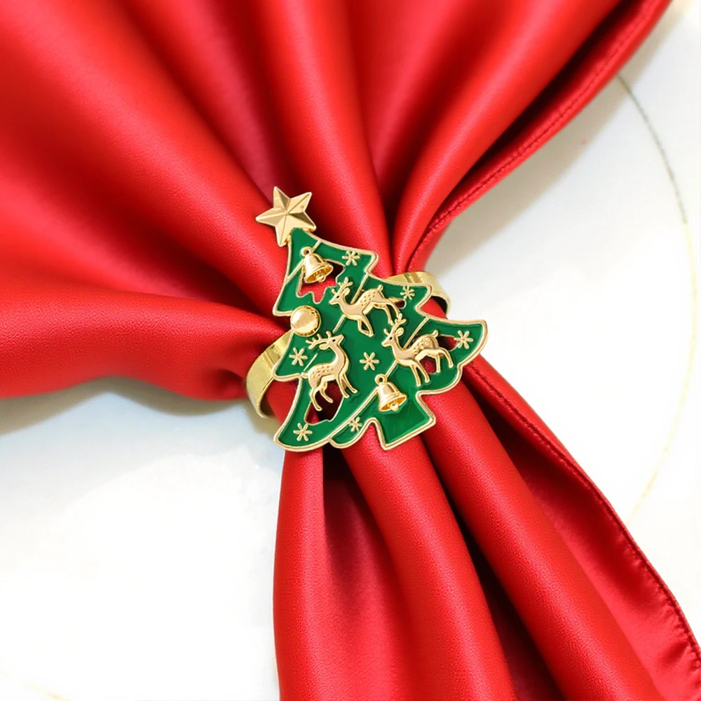 6Pcs Christmas Tree Napkin Rings with Deer Snowflake Bell ,Festive Table Decor for New Year Wedding Family Dinner Party Supplies