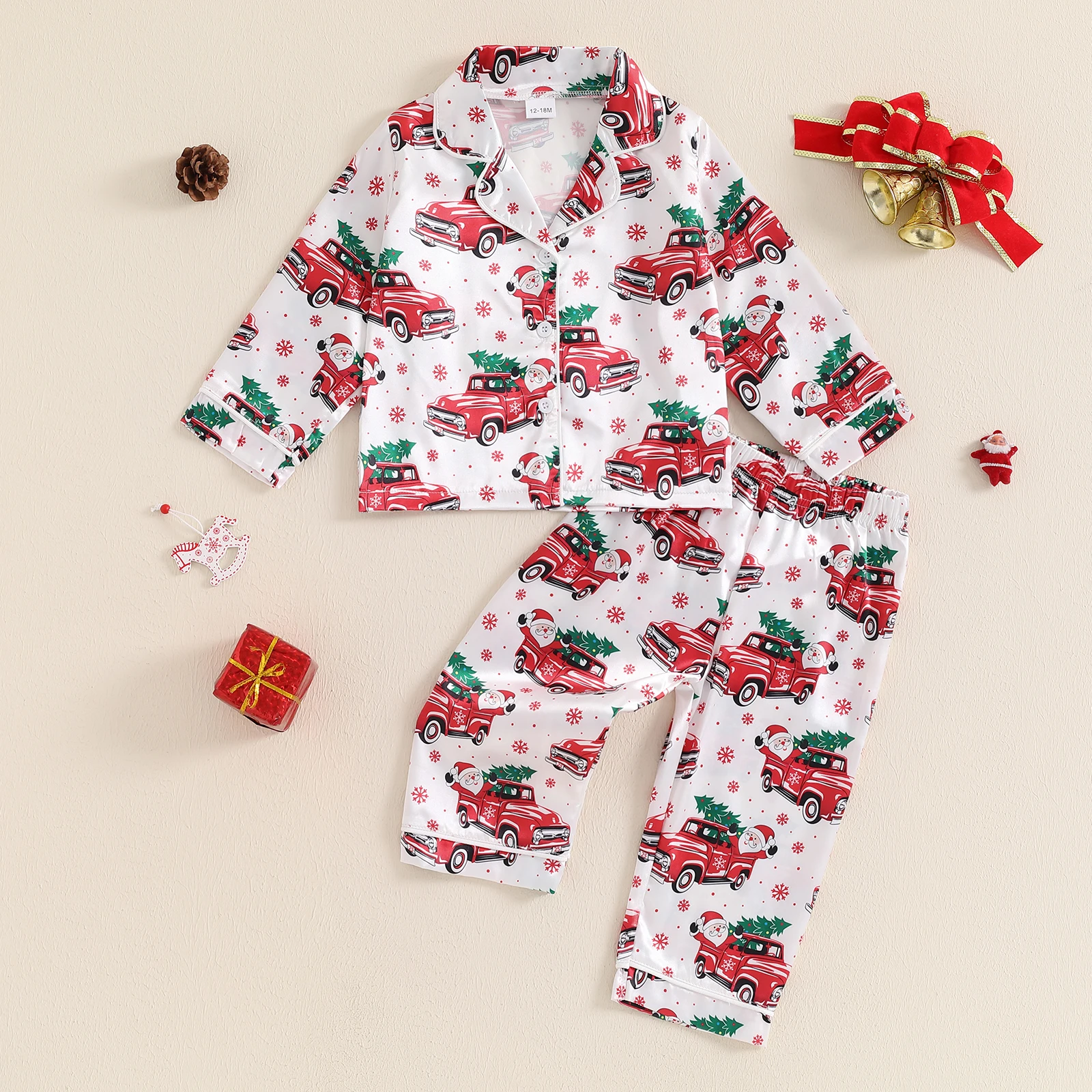 Toddler girls pajamas with Santa Claus print. Pajama top with long sleeves, front button closure and lapel collar. Pajama pants, elastic waist design, easy to fit, warm and cozy.