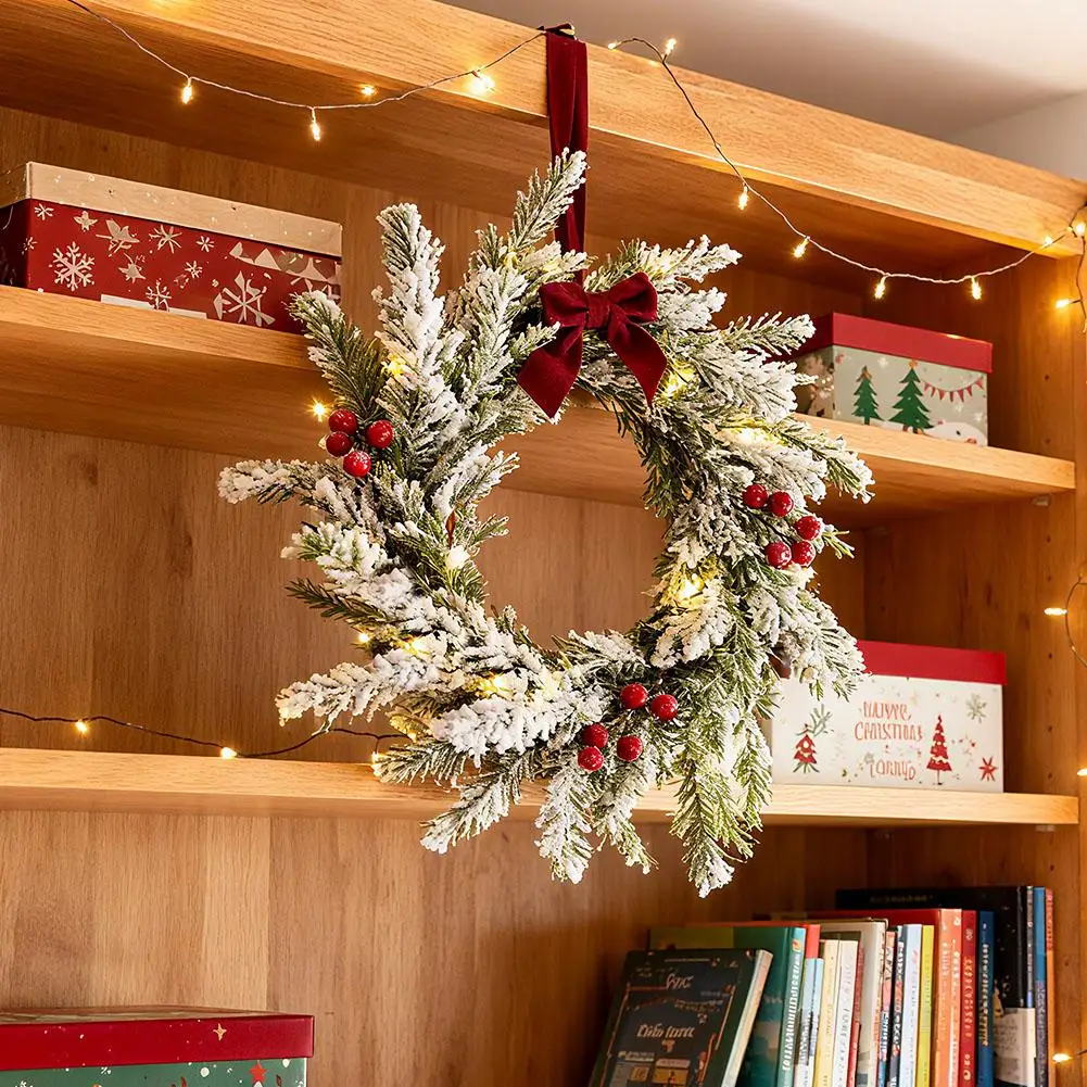 2. Designed with a classic holiday look, these small Norfolk-style wreaths combine lush green pine needles and bold red accents to bring timeless charm to your kitchen cabinets, windows, doors, or mantels during the Christmas season.