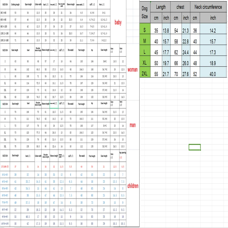 Size: Women/Men Size: S/M/L/XL/XXL/XXXL; Kids Size: 18 Months-2 Years/2-3 Years/3-4 Years/4-5 Years/5-6 Years/6-7 Years/7-8 Years/8-9 Years/9-10 Years; Baby Size: 3-6 Months, 6-9 Months, 9-12 Months, 12-18 Months, 18-24 Months; Dog Size: S/M/L/XL/XXL