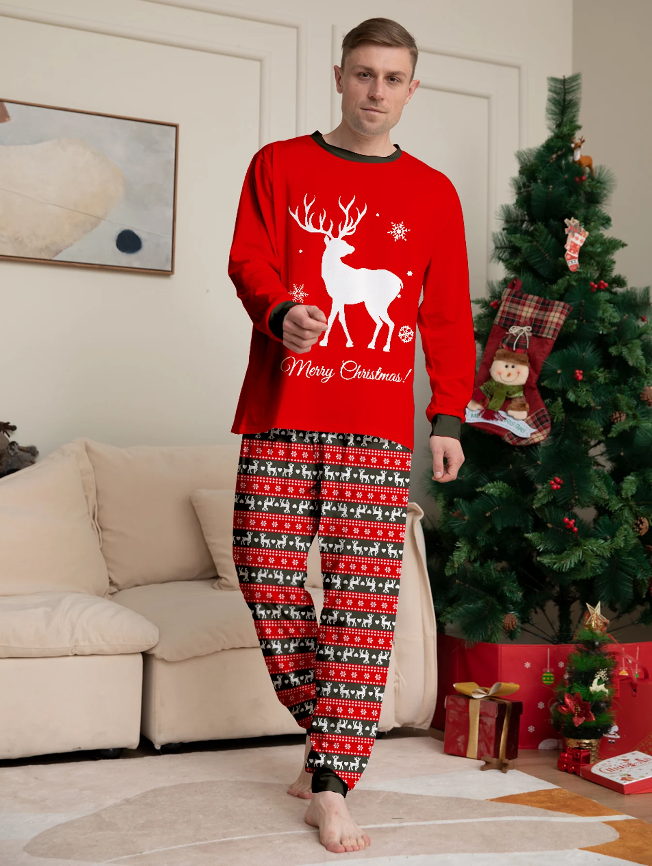New Christmas Couple Pajamas Reindeer Merry Xmas Graphic Red Long Sleeve Set with Nordic Pattern Pants