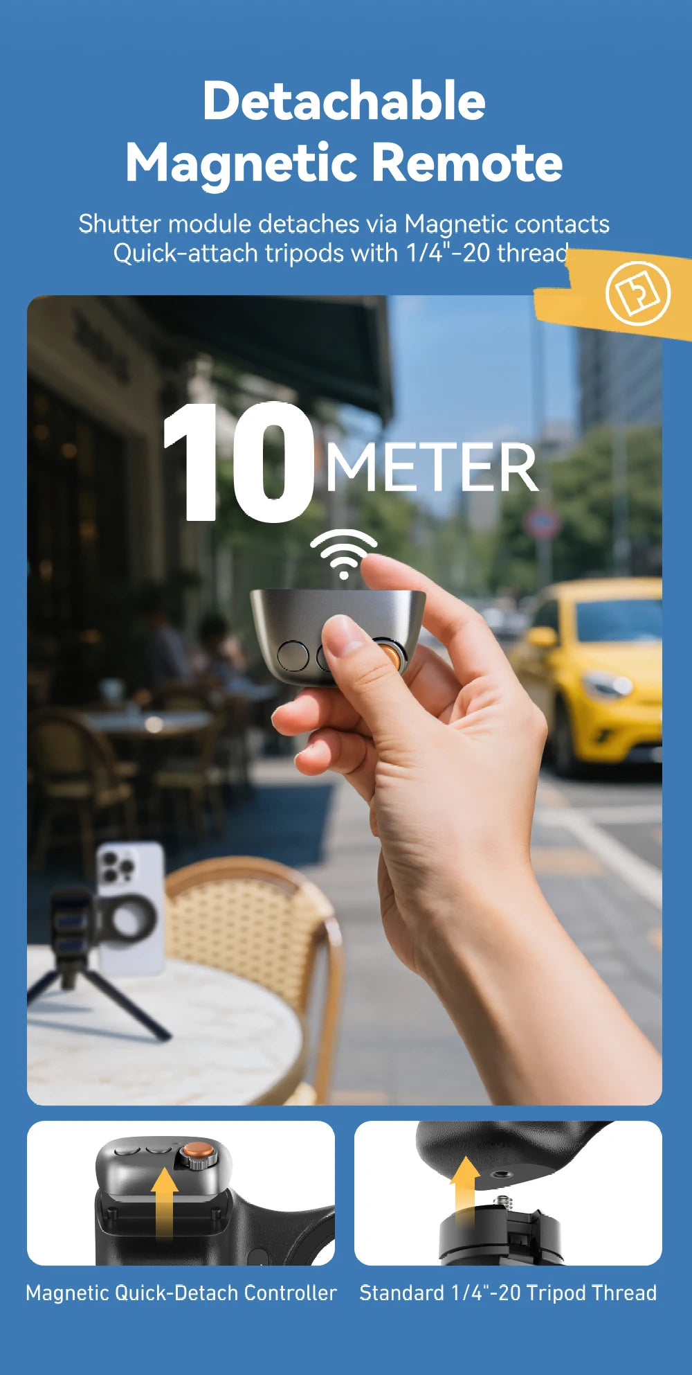 One-Handed Camera Control: Built-in Bluetooth remote for shutter, zoom, and mode switching