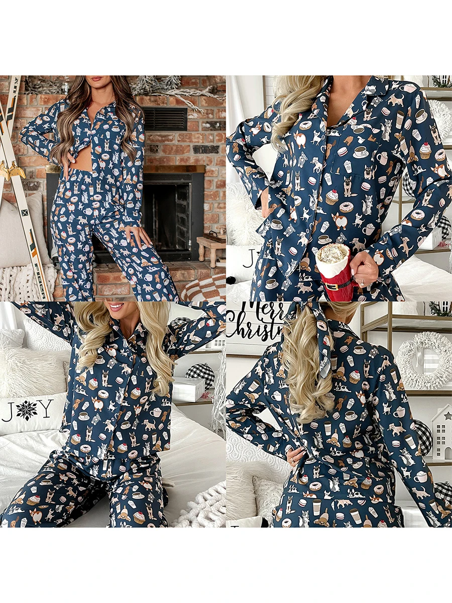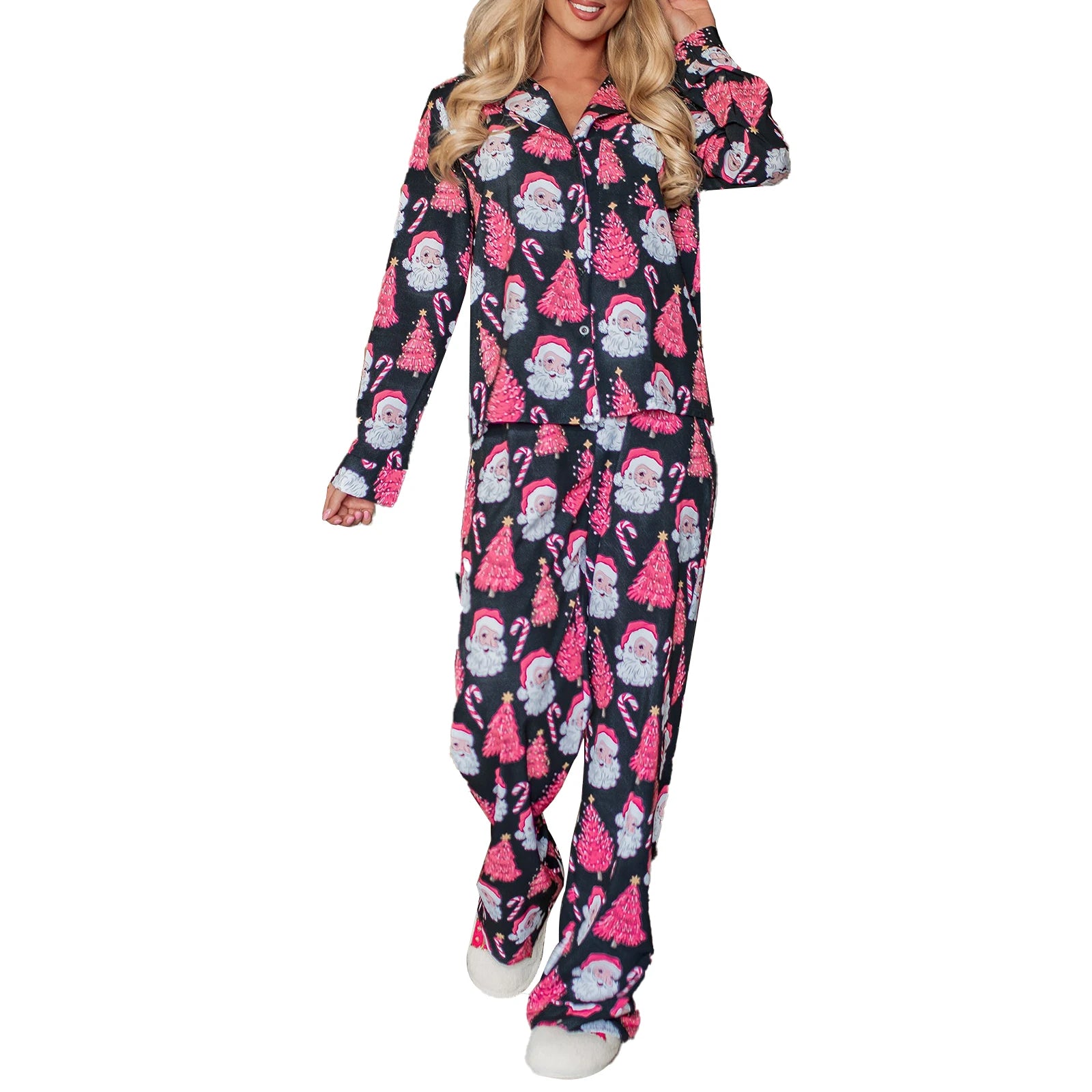 Womens Christmas 2Piece Pajamas Loungewear Set Santa/Tree/House Print Long Sleeve Tops+Elastic Pants Homewear Outfits