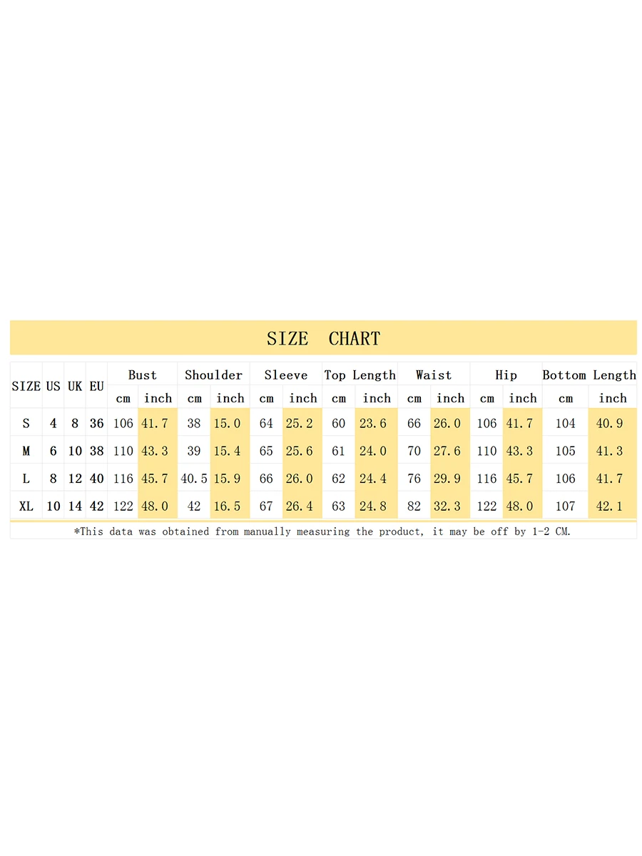 S Tops Length: 23.62 Bust: 41.73 Sleeve: 25.2 Shoulder: 14.96 Pants Length: 40.94 Waist: 25.98 Hip: 41.73